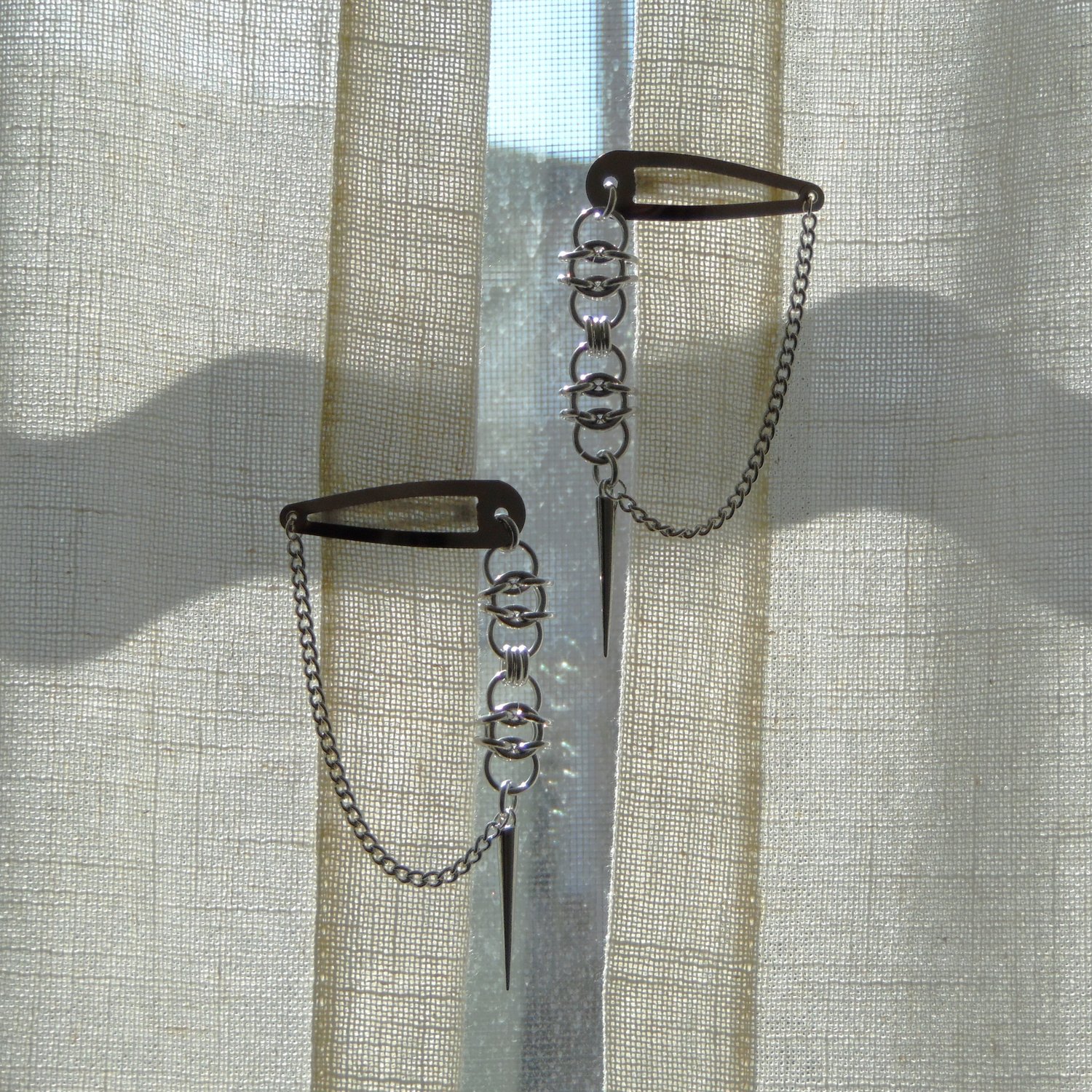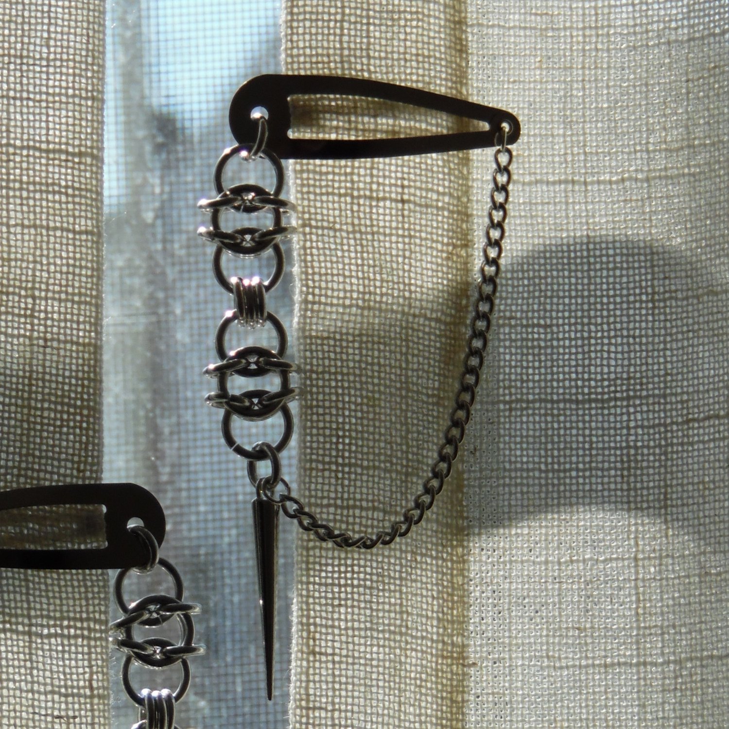 stainless steel chains and spikes, aluminum rings, metal alloy barrettes.